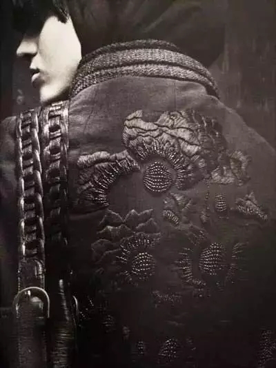 UMA WANG 2017秋冬巴黎时装周,大量采用冷染工艺做旧处理三维处理中最为著名的是压褶工艺,源于三宅一生对于材料的颠覆性创意及其国际时装界的巨大影响。三维肌理还包括镂空、盐缩、烂花等工艺,极大丰富了服装设计的表现力。