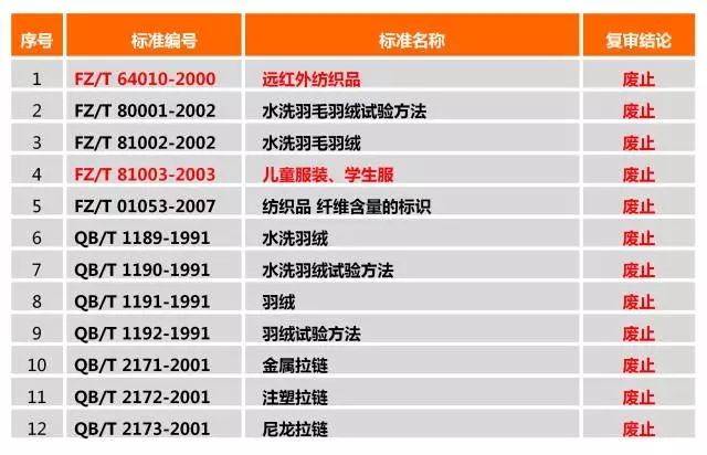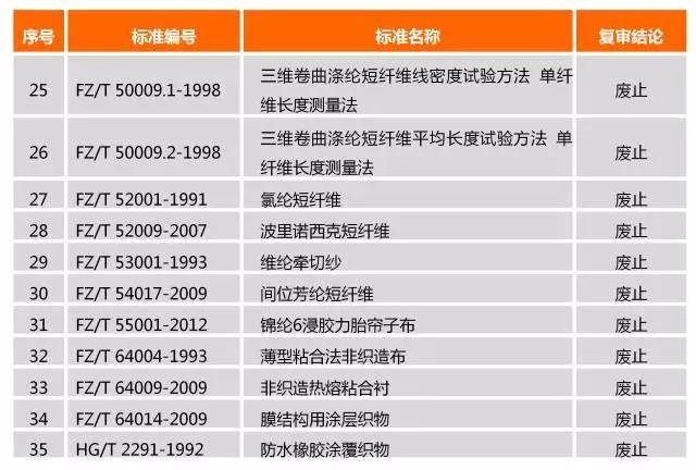 2017年6月2日,中华人民共和国工业和信息部发布2017年第23号公告,按照工业和信息化部推荐性行业标准集中复审工作的安排,现已完成28726项推荐性行业标准的复审工作。本次共计有2749项行业标准自本公告发布之日起废止(即2017年6月2日),其中包括《远红外纺织品》在内的35项纺织服装及皮革鞋类标准。具体废止纺织服装及皮革鞋类标准请见下列表格所示。