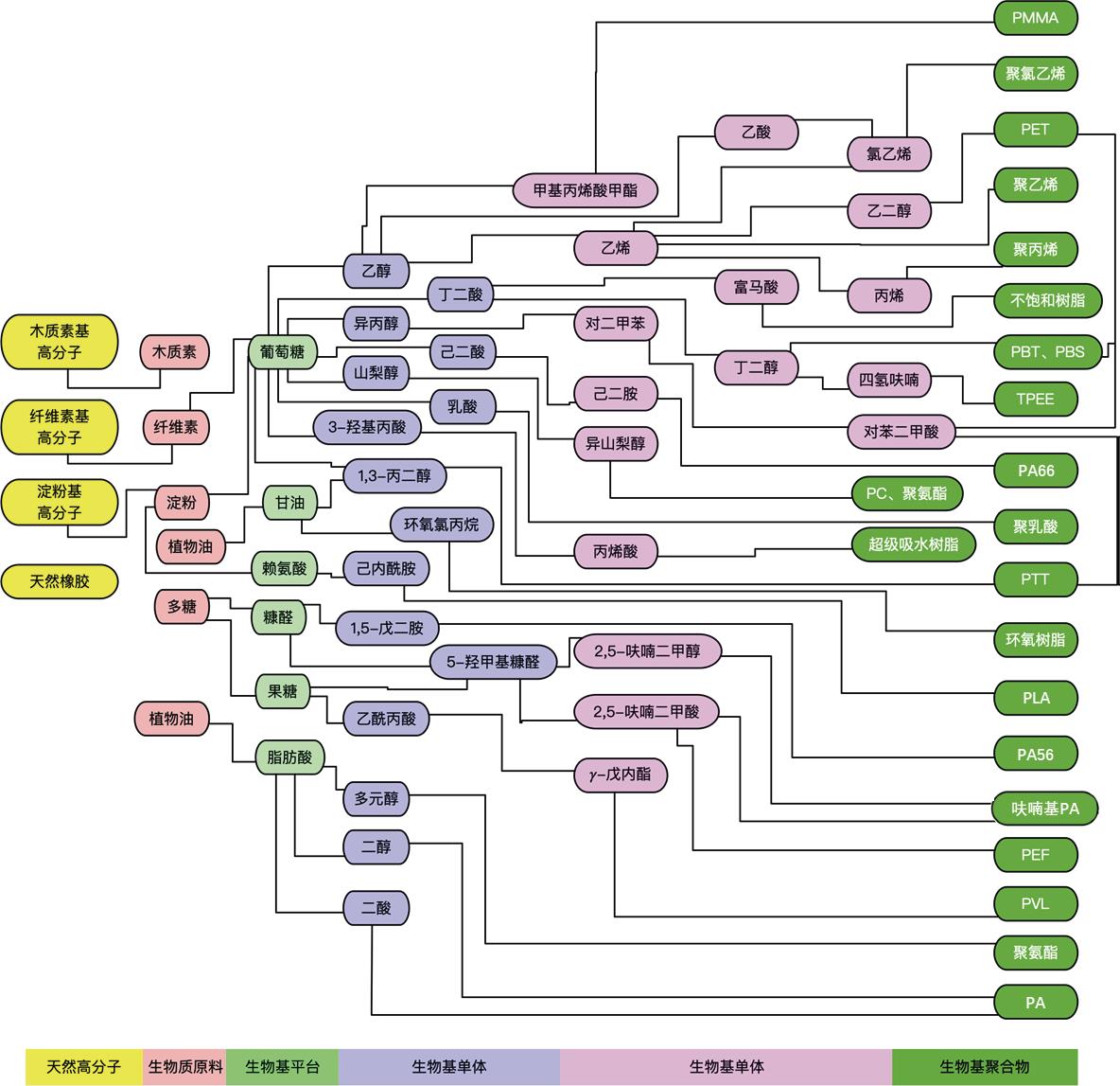 图 2 多种生物基聚合物的单体类型及生物质来源